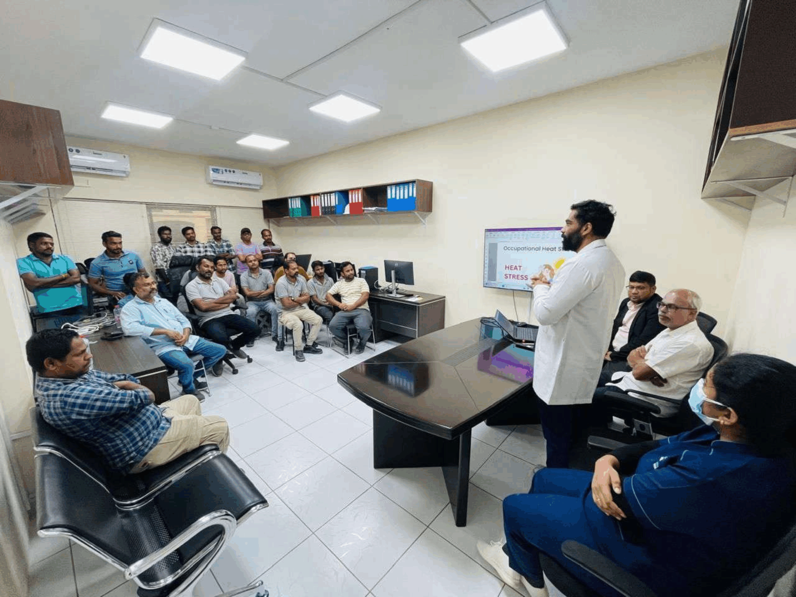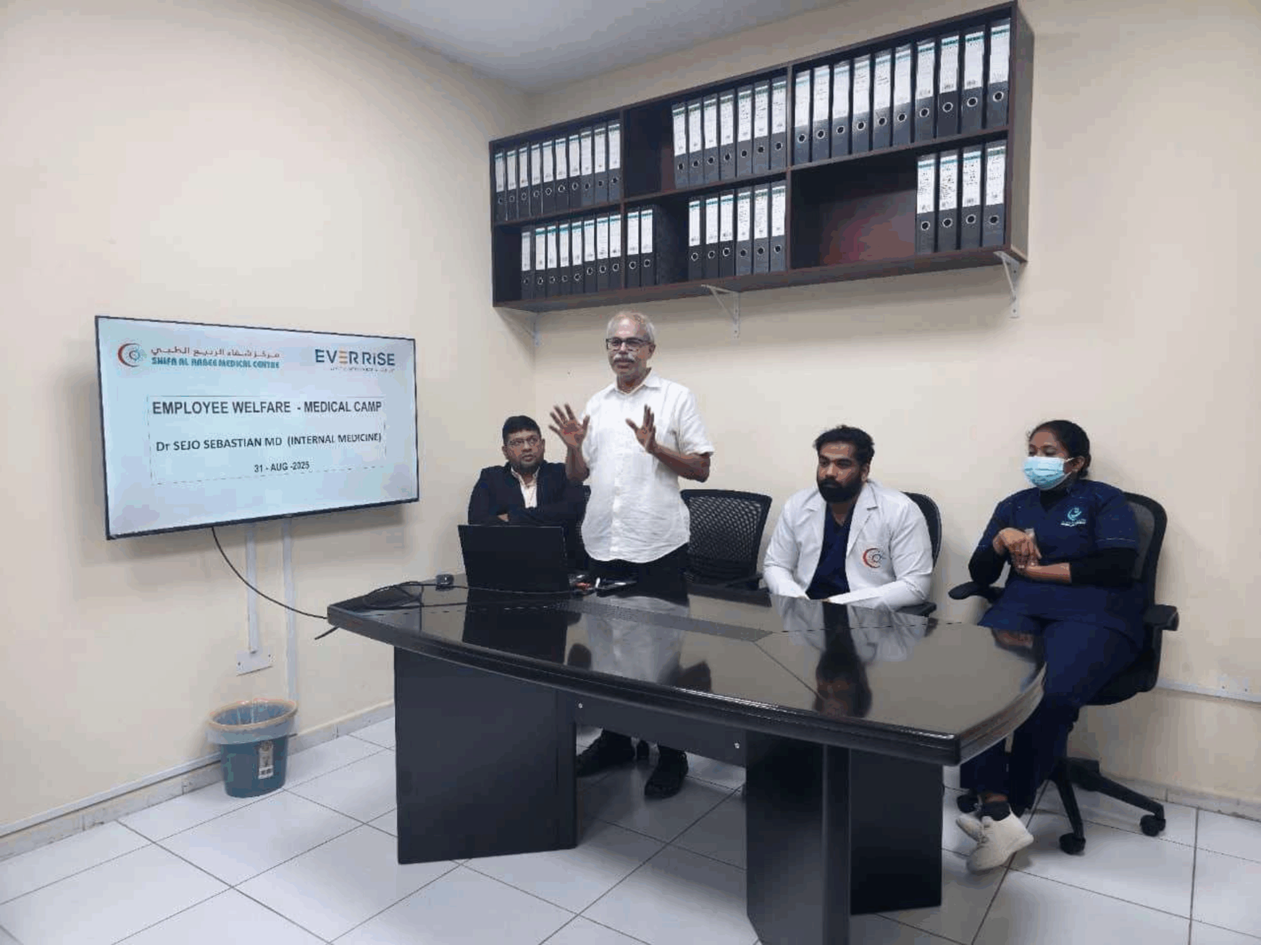 Ever Rise Electromechanical Works organized an Employee Welfare Medical Camp at its head office in collaboration with Shifa Al Rabee Medical Center. The initiative focused on promoting employee health and safety, offering free medical check-ups to more than 80 staff members. Led by Dr. Sejo Sebastin, the camp also featured an awareness session on Heat Stress Management, highlighting prevention, early warning signs, and first-aid measures. The event, presided over by Mr. Unnikrishnan Earath (MD & CEO) and Mr. Rizwan Amirjohn (Senior BDE Manager), reflects Ever Rise’s strong commitment to employee welfare, QHSE standards, and UAE labor welfare compliance.